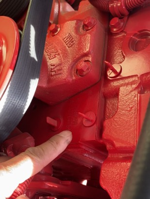 2、東風(fēng)多利卡D9灑水車,配康明斯230馬力發(fā)動機(jī),發(fā)動機(jī)缸體號,在發(fā)動機(jī)的前方,主駕駛座椅下面的位置,找到皮帶輪,靠近身體一側(cè)的皮帶輪旁邊有兩個塑料,像以前老式電視機(jī)調(diào)頻道的開關(guān)一樣的配件,這兩個配件,上下在一條直線上,這兩個配件中間就是缸體號。