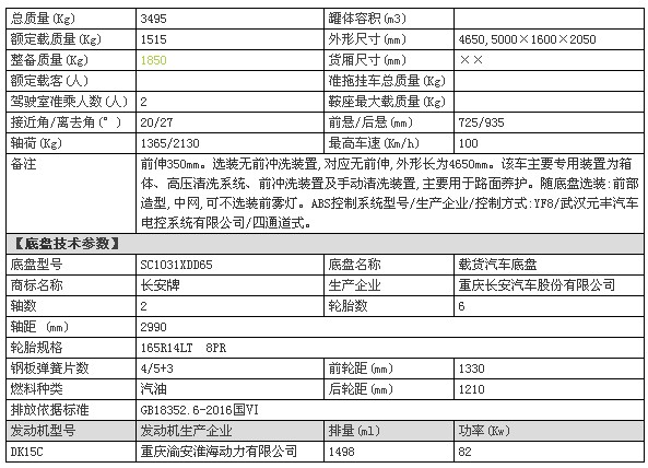 采用長安底盤,軸距2990mm,后視鏡帶轉向燈,重慶渝安112馬力發動機,5檔變速箱,前盤后鼓剎車,帶ABS,175真空胎,直通大梁,帶原廠空調、原廠電子方向助力、原廠獨有變速箱取力器。