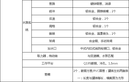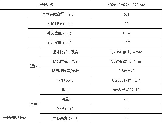 整車帶一個專用40/50大功率灑水泵(垂直最大吸程6米),多功能灑水車配備2個前沖(噴)(能將路面泥巴、塵土、垃圾沖干凈);前沖可沖洗約7-8車道,高炮射程26米,2個后灑(能均勻地將水灑在路面,一次灑水寬度14米)、2個側噴(花灑)(能均勻地將路旁綠化帶澆灌)、帶1個后工作平臺,平臺上安裝1個綠化灑水高炮(灑水炮可全方位旋轉,可連續調成直沖狀、大雨、小雨、毛毛雨,霧狀可調節沖洗高大樹木),引水時間小于4min,流量40m3/h。帶1個消防接頭,帶1個自流閥,1個過濾裝置、人性化爬梯及側防護欄,安裝灑水音樂喇叭,配專用水泵(泵進泵出)及消防栓接口,兩根等長輸水管,金屬漆,其余標配。用戶可選裝消防大功率消防水泵、應急時可做消防灑水車使用。