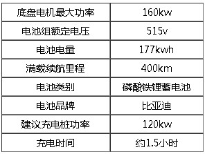 匹配的是5塊磷酸鐵鋰蓄電池,電池容量是175kWh續航里程每小時240 km,充電功率是直流108/選配交流40 kW,充電時間是直流1.5,交流4.5 h。