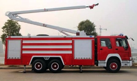 23、舉高噴射消防車:該車屬于舉高類消防車,主要用于高層建筑火災(zāi)撲救。由汽車底盤和兩節(jié)或多節(jié)臂組成,臂的頂端單獨(dú)或同時(shí)設(shè)有水炮(泡沫炮),在轉(zhuǎn)臺(tái)或地面上遙控操作,噴射炮可通過液壓馬達(dá)實(shí)現(xiàn)一定角度范圍的內(nèi)俯仰,可調(diào)節(jié)噴射水成直流狀或開花噴霧狀,能有效的控制較大面積的火災(zāi);該車還配有一套高強(qiáng)度高揚(yáng)度的水泵系統(tǒng),能將泡沫混合液或水提升到高空后,在任意角度和方向都能進(jìn)行噴射。