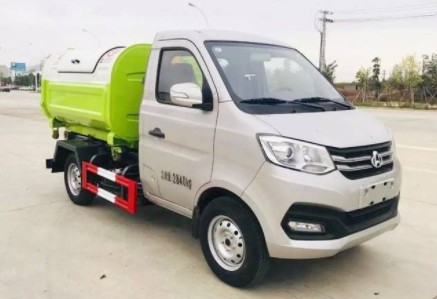 3、鉤臂式垃圾車(chē)箱放置好后,調(diào)整活動(dòng)拉臂鉤與箱體彎鉤位置,使其脫鉤,將鉤臂操作手柄推下到落下位置,鉤臂油缸收回,活動(dòng)鉤臂繞翻轉(zhuǎn)翻轉(zhuǎn)架前鉸鏈軸旋轉(zhuǎn),活動(dòng)鉤臂放回到附車(chē)架上,松開(kāi)取力器垃圾箱放置完成,整車(chē)可以運(yùn)輸行駛。